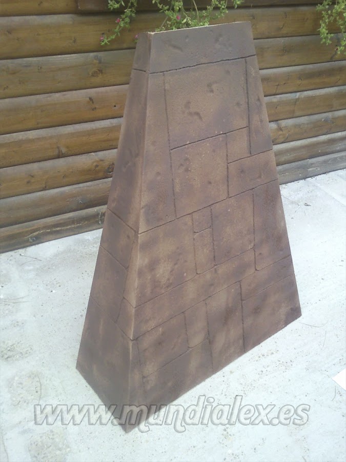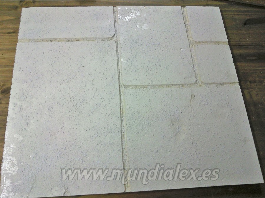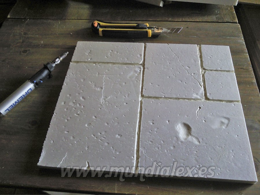 Para dar textura a nuestras falsas piedras, basta con poner la placa de poliestireno en un suelo rugoso(hormigón, por ejemplo) y pisotearlo para que se marque.