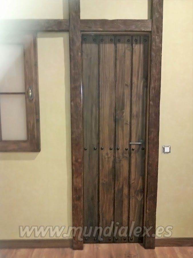 Para nuestro cambio radical de la puerta del baño, colocaremos sobre esta un tablero de pino de 16mm fresado en forma de tablones. Le aplicaremos protector para la madera en color roble, pintaremos la manilla en forja y pondremos 24 clavos negros de adorno.