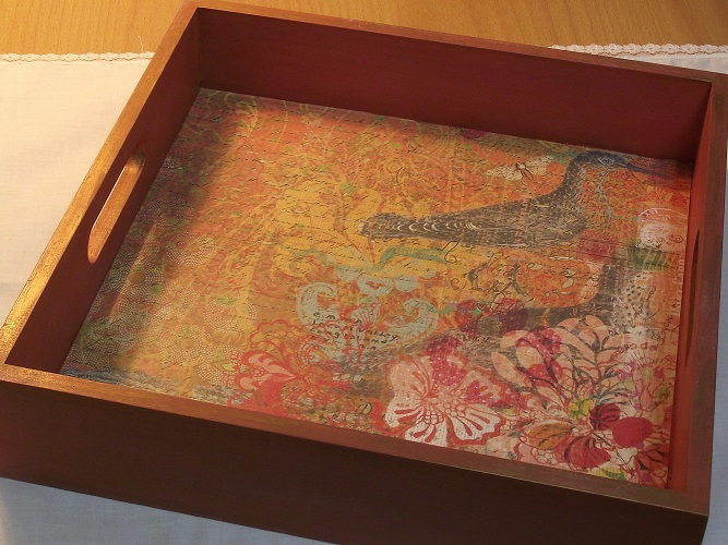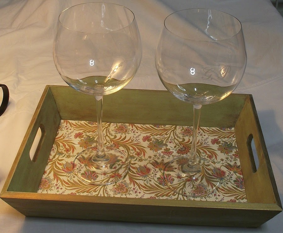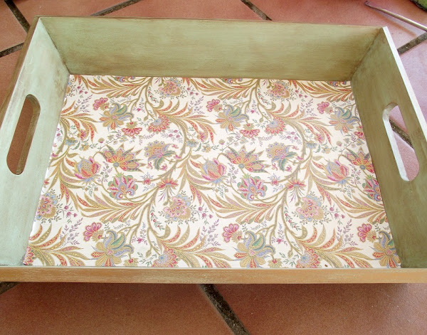 Una vez bien seca la pátina (dos o tres días) apliqué barniz incoloro mate (también en spray) a todo el contorno de la bandeja, para proteger bien. Y ya me dispuse a colocar este papel italiano, que compré en una feria de manualidades que hubo en mi ciudad.
