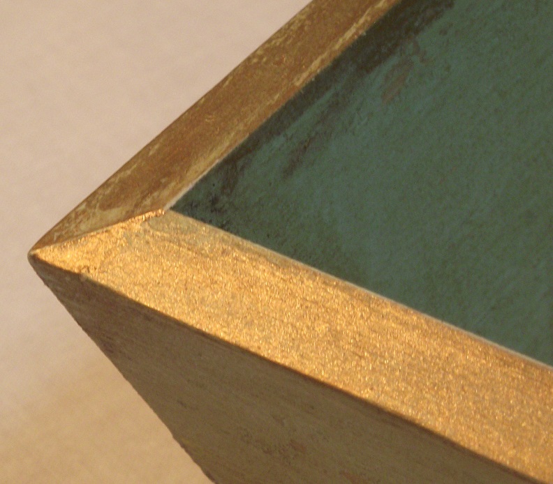 Una vez estuvo pintada apliqué pátina color sombra (mi súper pátina universal, que uso para casi todo jaja) y la combinación dio como resultado un color verde seco, antiguo, que me encanta. Retiré, como otras veces, más pátina por el centro de las tablillas y dejé que se acumulara en los extremos, las uniones y los ángulos, como os enseño en esta foto.