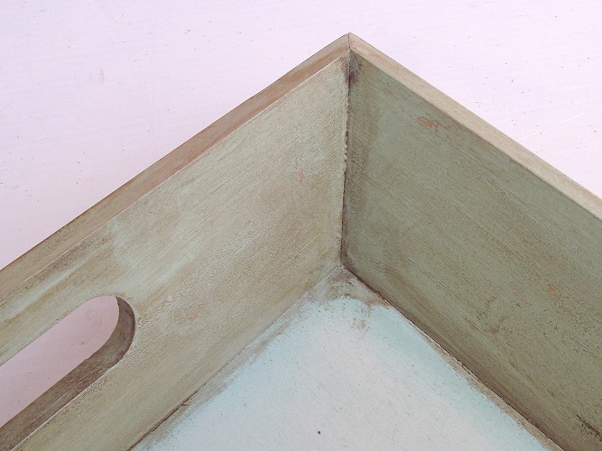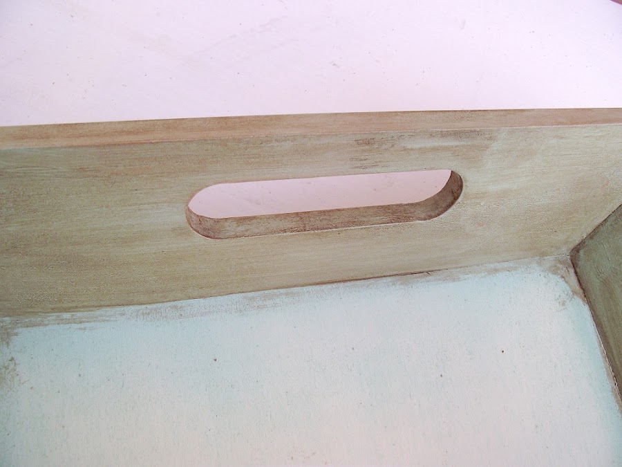 La primera bandeja la pinté con pintura color verde menta. Veréis que éste no es un color que use normalmente, peeero lo compré porque suponía que con la pátina color sombra iría muy bien. Y no me equivoqué.
