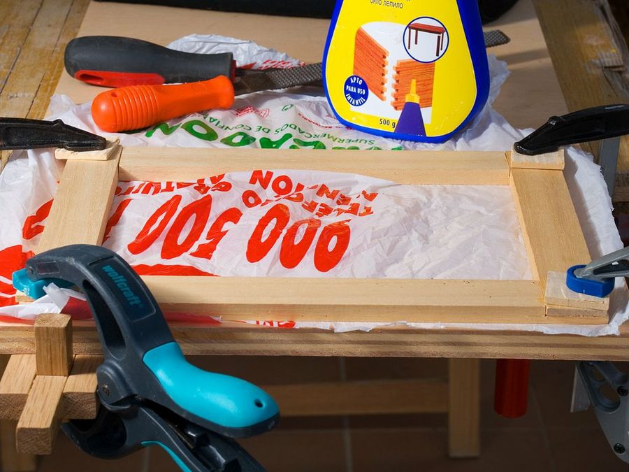 El marco es la pieza decisiva del humilde expositor, y para hacerlo perfectamente plano encolamos los ensambles sobre un recio tablero. Hemos puesto un plástico para evitar que la cola rezumante provoque adherencias indeseadas.
