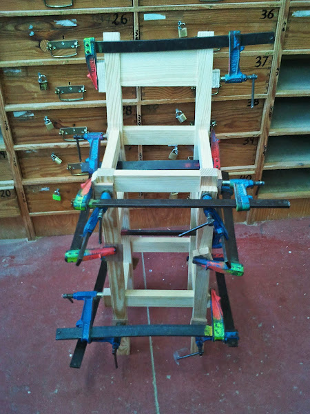 Bueno en la foto las piezas ya estaban todas elaboradas menos el asiento, todo en madera de pino, estaban en proceso de colado con todas las torniquetas colocadas, en principio no hay nada especial que resaltar, hay quien no adquirio cierta maña con las maquinas, entonces lo hace sin respaldo, por lo demas todo igual.