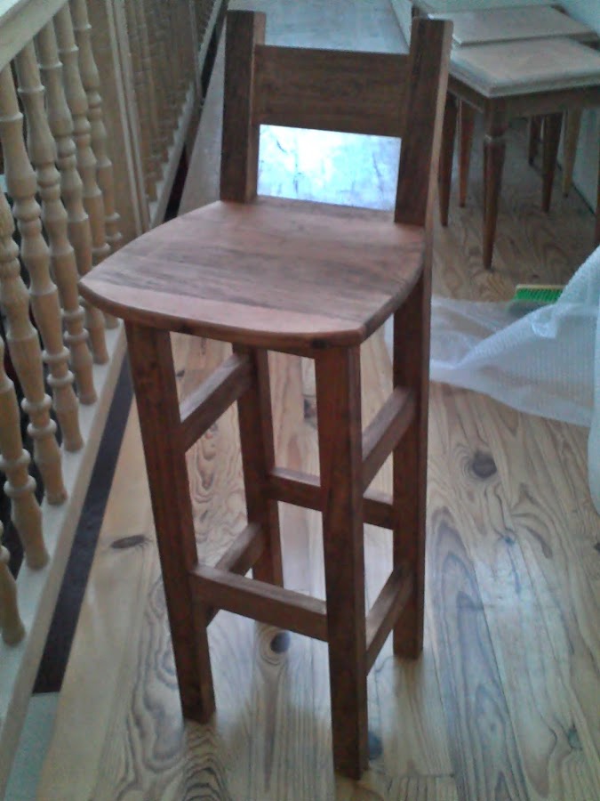 Aquí vemos el taburete terminado, yo para mi gusto le di un tinte color cerezo que era el que mas me gustaba, en la foto igual no se aprecia perfectamente el color, el asiento va colado con varios tarugos, es la unión a tope de 3 tablas, donde las uniones no coincidieran en el limite de la estructura para que con el peso no pudiera partir (ya que el taburete que tenemos del bar es donde rompió)