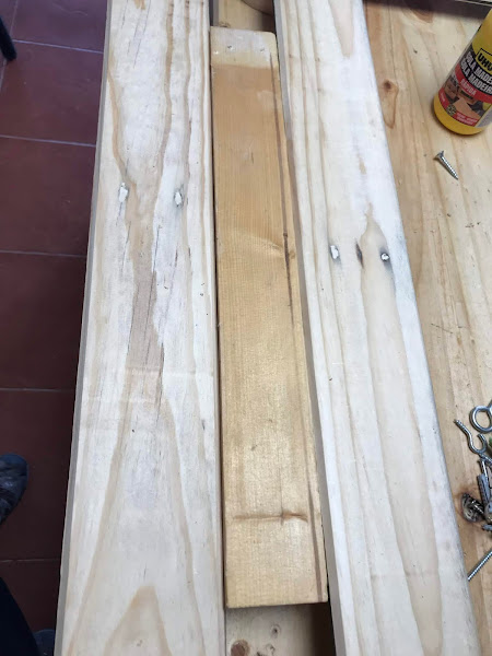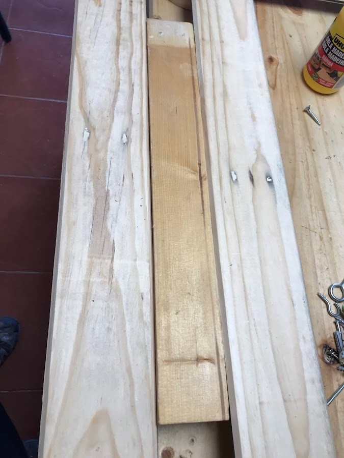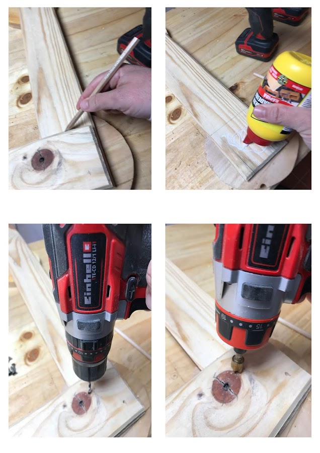 Ahora tocaba empezaba a unir los listones verticales con los horizontales. Para ello, siempre coloco un listón encima del otro y hago una marca con el lápiz para saber hasta donde poner cola rápida . Luego taladro y avellano la perforacción para esconder la cabeza de los tornillos.
