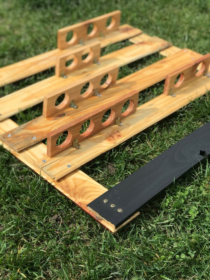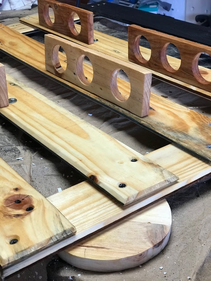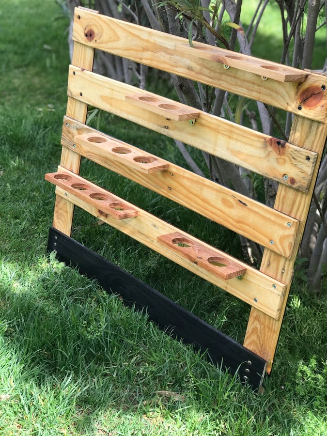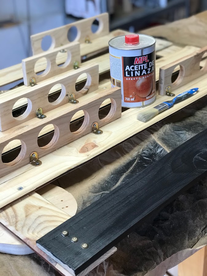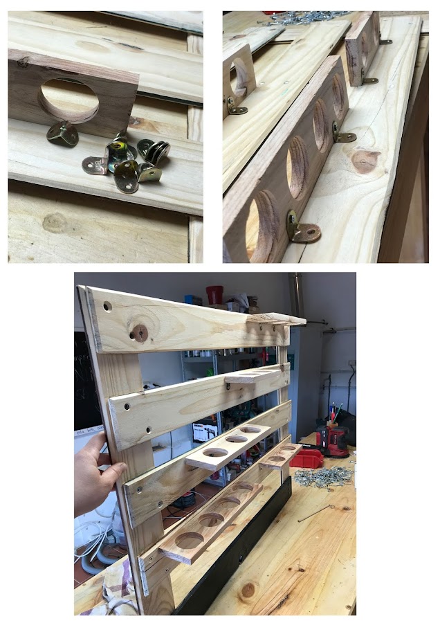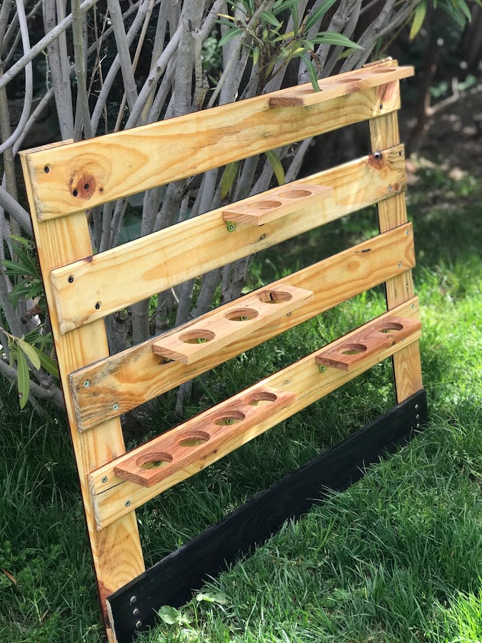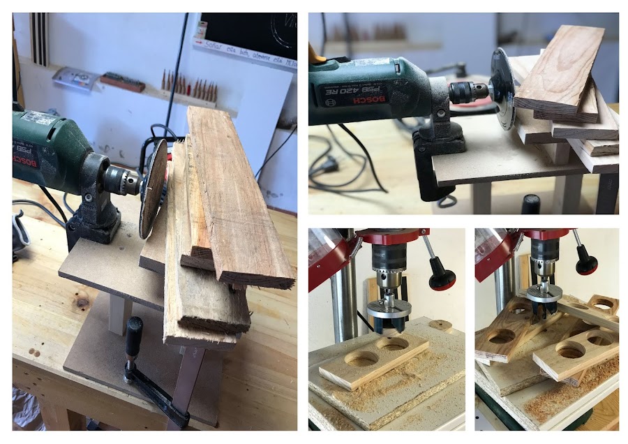 Con dos listones más de palets hice las mini baldas donde irán las macetitas. Utilicé el taladro de columna y una broca de corona para ir haciendo todas las perforacciones. Previamente las pase por mi taladro/lija para quitarles todas las astillas y dejarlas bien suaves.
