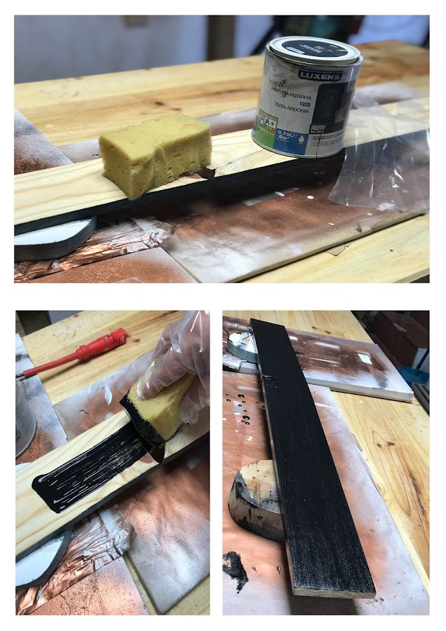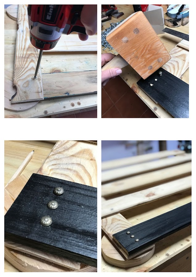 Este último listón quise atornillarlo por la parte de atrás porque quería ponerle unas tachuelas rústicas como adorno. Para ello, hago una pequeña perforacción y me ayudo con mi super mazo de madera para colocarlas.