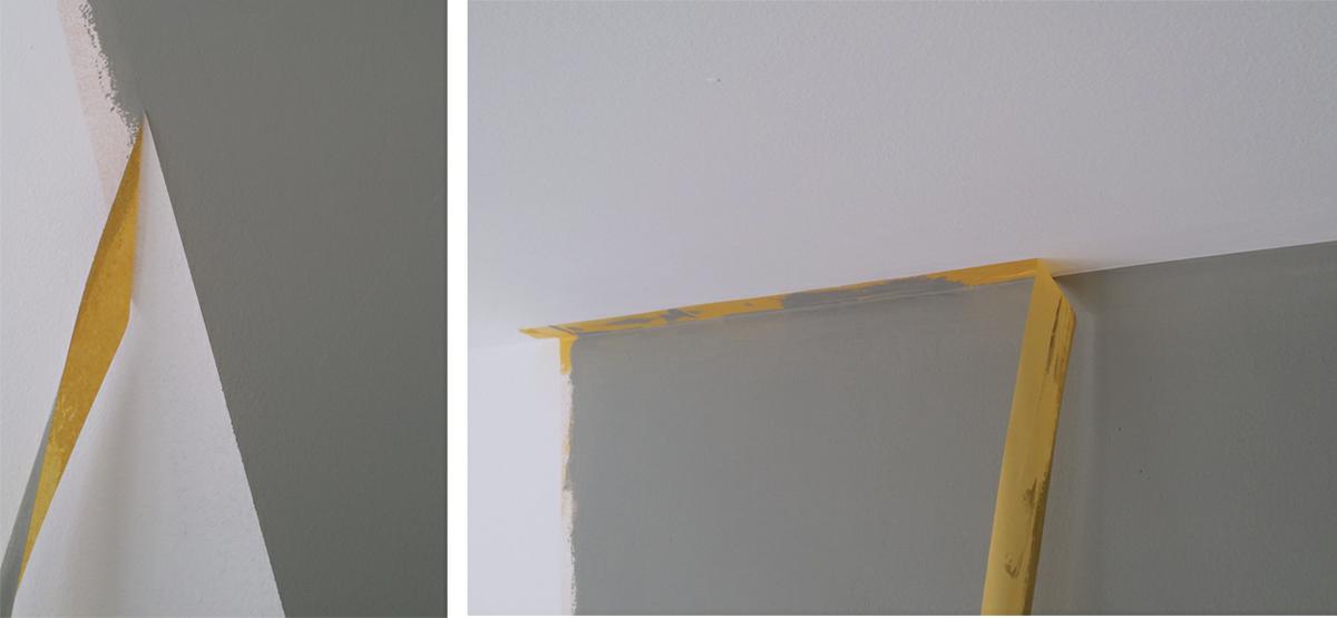 6. Pintamos de gris hasta cubrir bien la pared y una vez seco quitamos la cinta washi, que pusimos hasta en el techo para no equivocarnos al pintar.