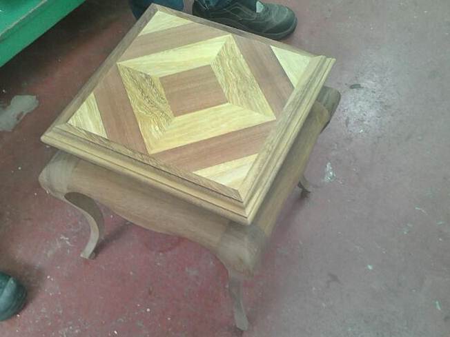 Bueno aquí una mesita pequeña con patas cabriole con unos lazos cruzados tallados a mano. Se hicieron varias mesitas mas, pero con diferentes tapas, y sin los lazos, siguiendo la tapa la curva de la pata cabriole, pasándola por la tupi con una fresa de radio 40.