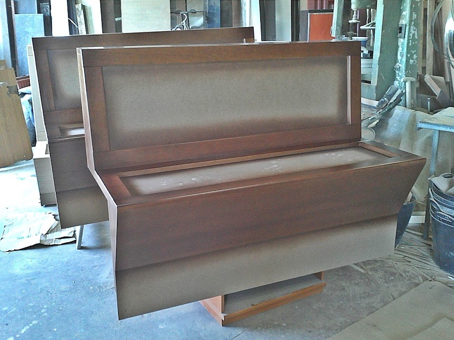 Se le añadió tablero chapeado de castaño y listones de castaño para hacer los perfiles de los asientos y respaldos, ya que llevara un acolchado.