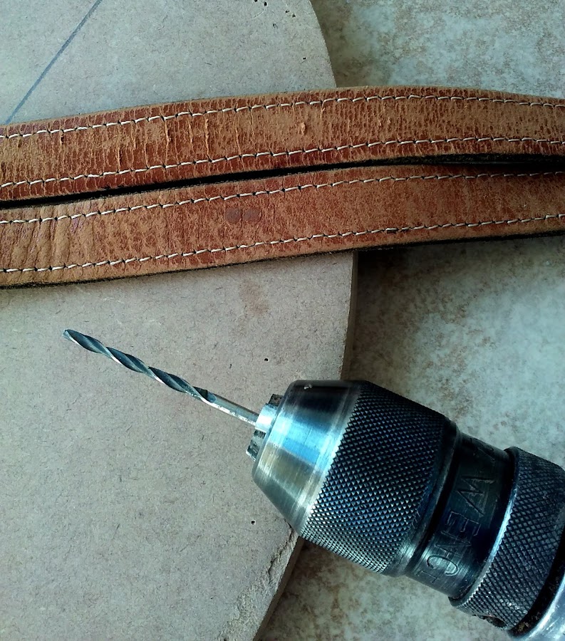 Con el taladro perforé el cuero del cinturón y la tabla en el lugar donde irán los tornillos para sujetar las manijas.