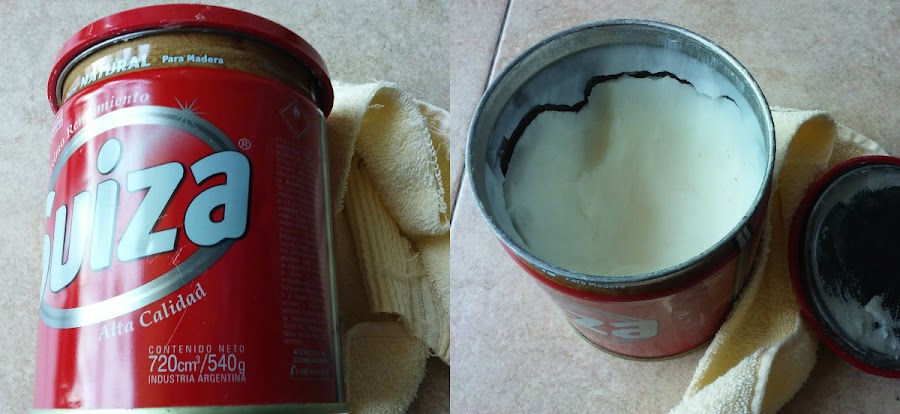 Luego, con cera para pisos incolora en pasta y un trapo, froté bien la tabla (y mi dibujo).