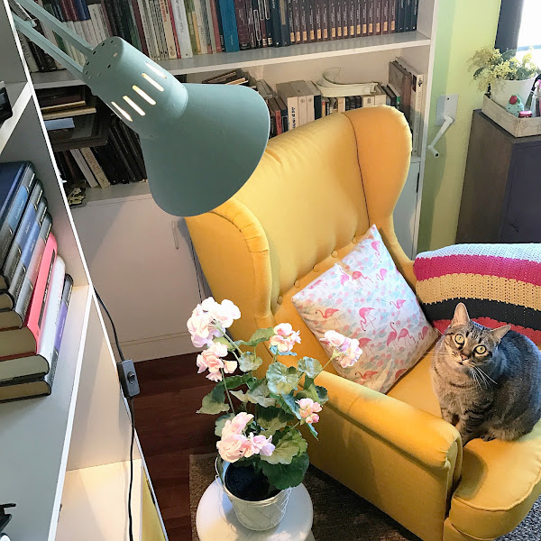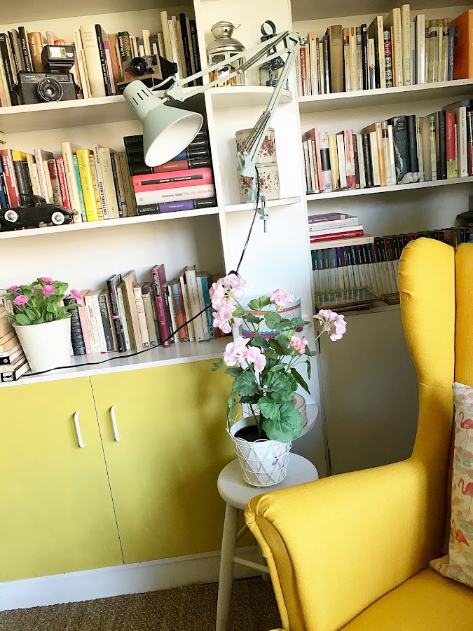 Todo cuadró a las mil maravillas cuando puse el sillón amarillo STRANDMON de Ikea (maldita sea, ahora lo hay en turquesa también, es precioso) en el salón, necesitaba un punto de luz para leer y se me ocurrió rescatar en flexo: