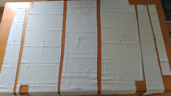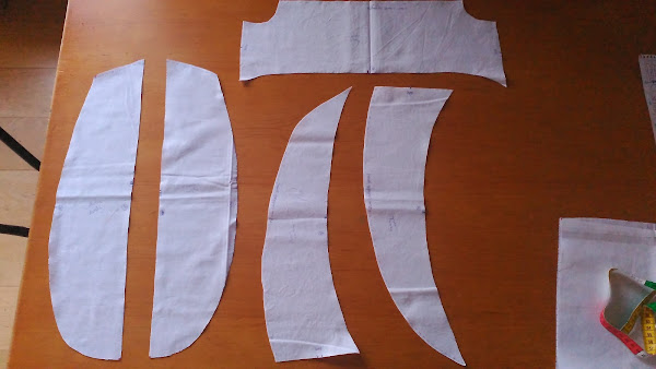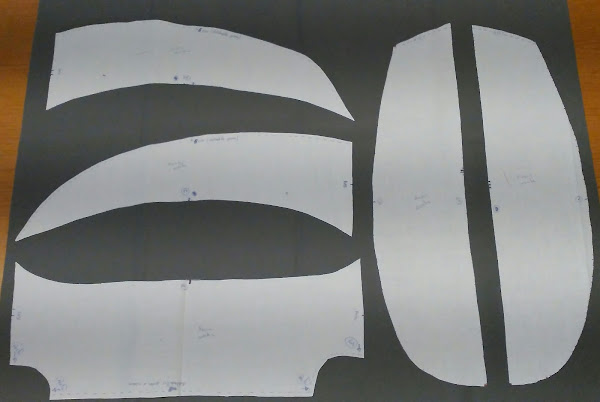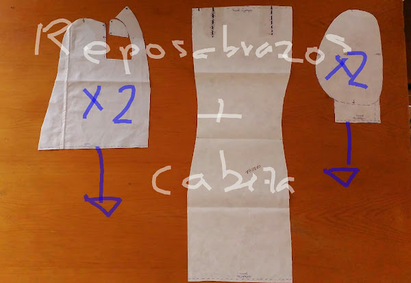 - Calcular y cortar la tela (utilizaría uno liso y otro estampado) en las medidas necesarias según la pieza a montar (para ello cree un mapa de medidas del conjunto de piezas a marcar en la tela y así poder calcular los metros de tejido necesarios con el máximo aprovechamiento posible del tejido).