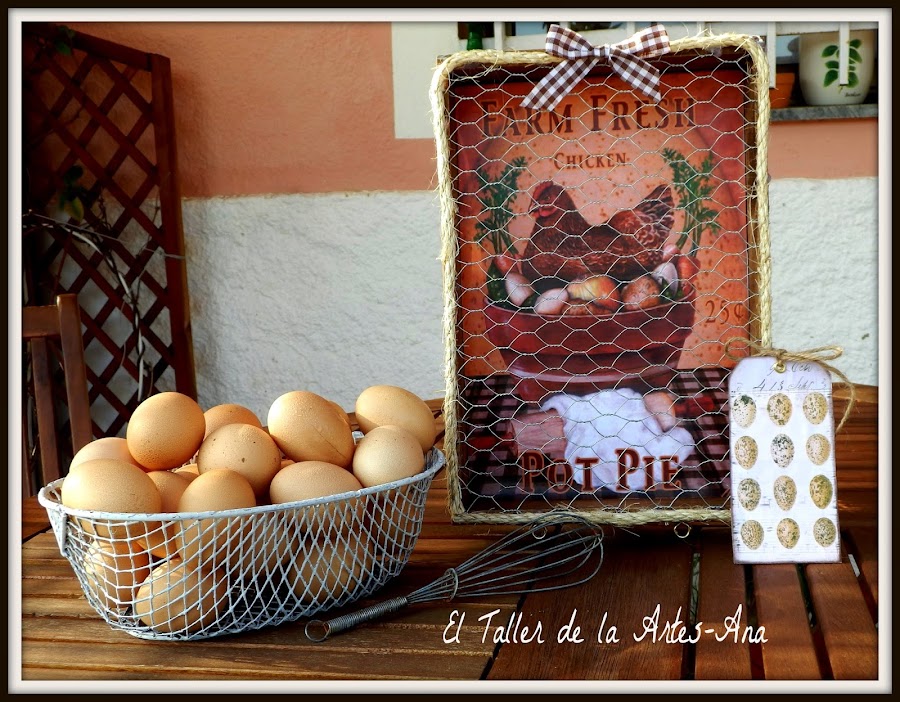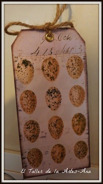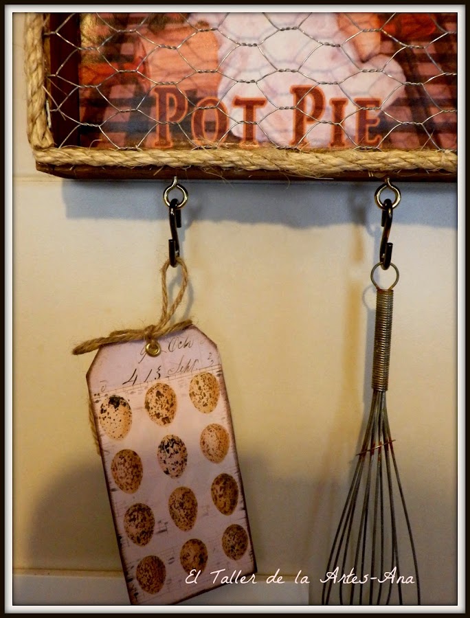 También hice con un trozo de cartón y una cuerdita un tag que le va muy bien (aunque no sean huevos de gallina...). Envejecí los bordes con las misma mezcla de cera y betún aplicada con una esponjita.