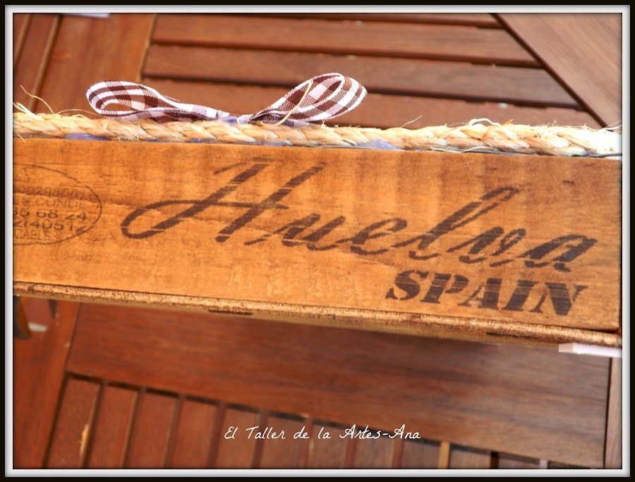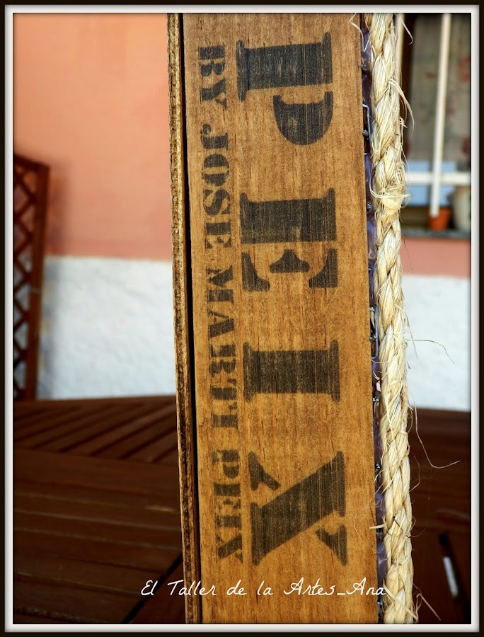He utilizado una caja de madera donde vienen las gambas. Después de lavarla muy bien con lejía para que se quite el olor, simplemente la he teñido con una mezcla de cera blanca y betún de judea para oscurecer la madera y proteger a la vez. Quería que se vieran las letras de la caja.