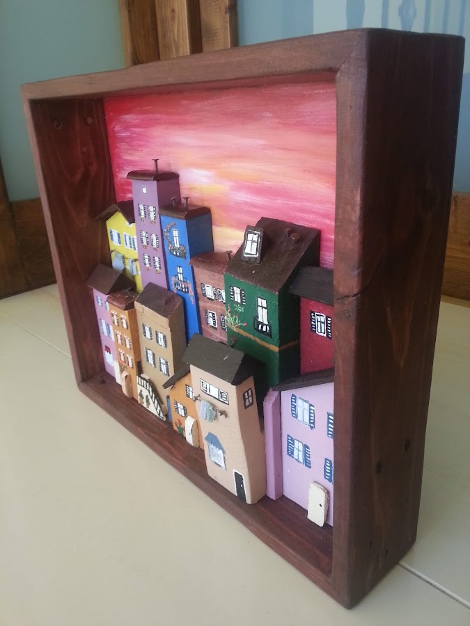 Este ya es el cuadro terminado, como pueden ver con acrílicos pinto cada casita de un color procurando añadir todos los detalles posibles, con un picel muy fino.