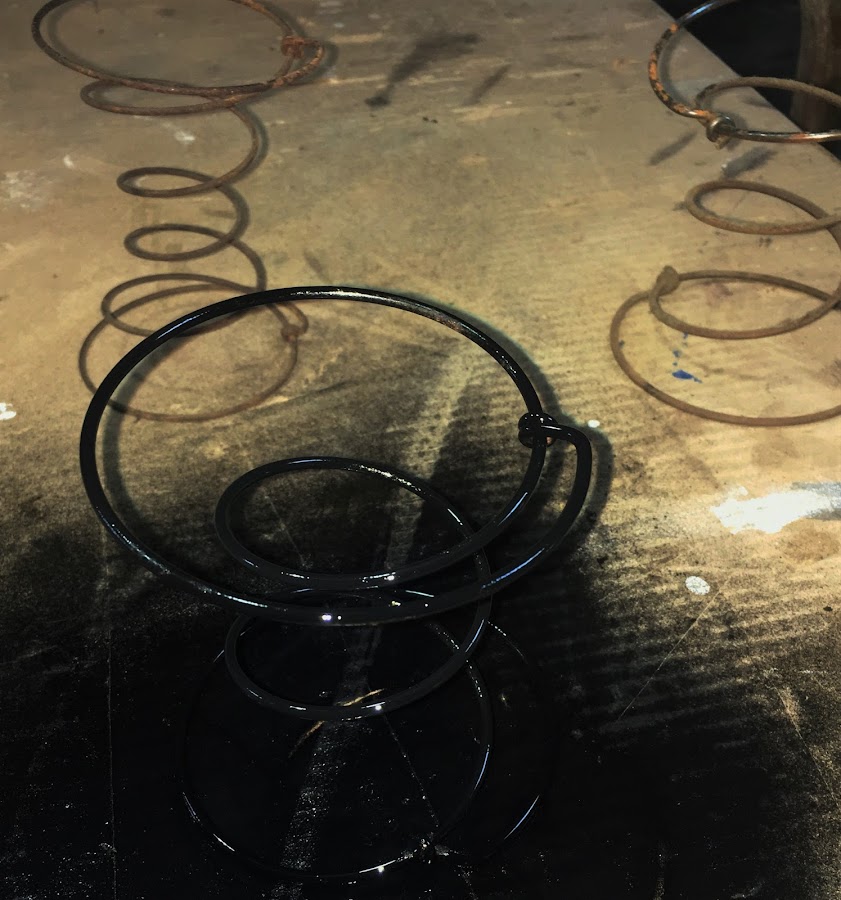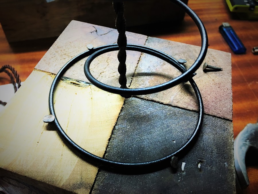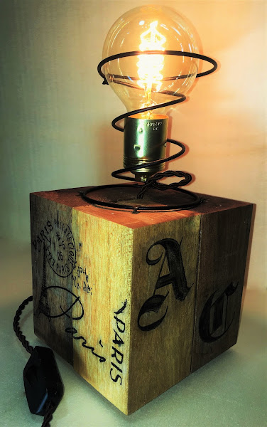 Pues ya decorado el cubo empezamos con la instalación eléctrica de la lampara, con una broca de madera del numero 8 hice un talado de lado a lado para pasar el cable. Para la sujeción de la bombilla me pareció perfecto un muelle antiguo ya que me daba la sensación a primera vista que estaba hecho para ello. Eso si le pinte en negro para que conjuntase con las imágenes y quedara todo mas uniforme.