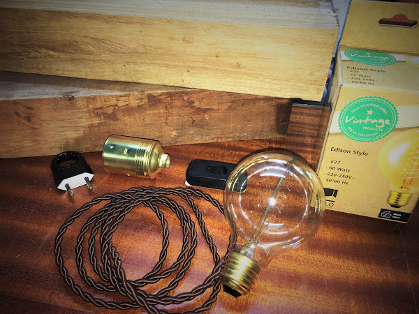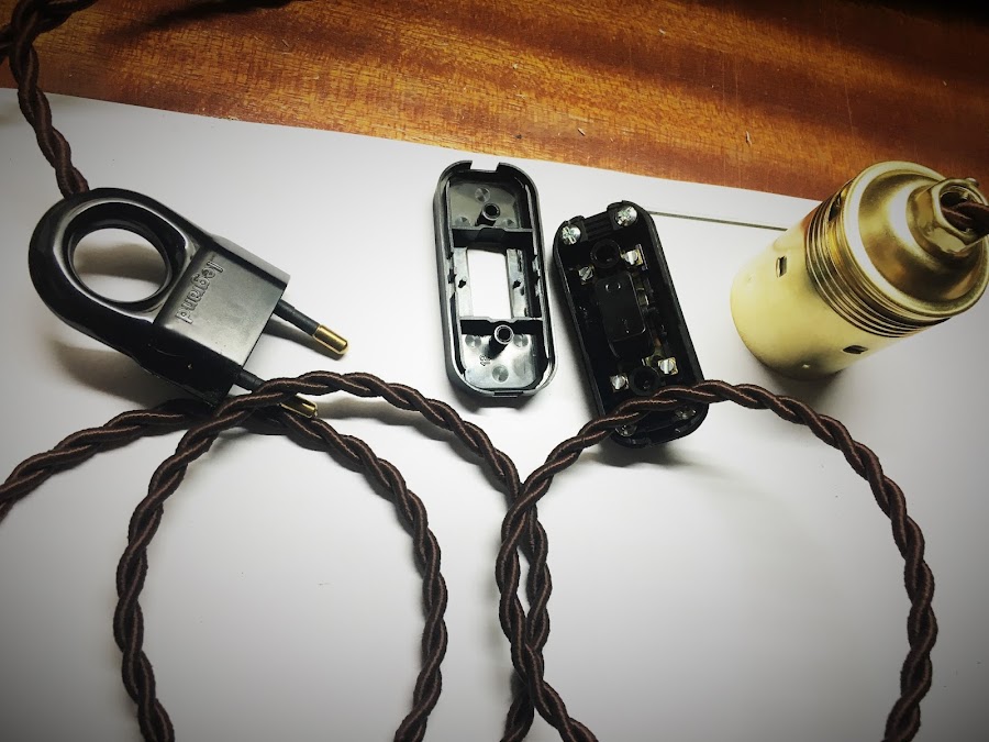 He elegido un cable trenzado y forrado en tela que creo de iba muy bien al estilo de la lampara, el casquillo le encontré casualmente en un gran almacén pero es estilo antiguo y me gusta mucho, y lo demás con piezas normales que tenia en el taller y se pueden encontrar fácilmente en cualquier ferretería.