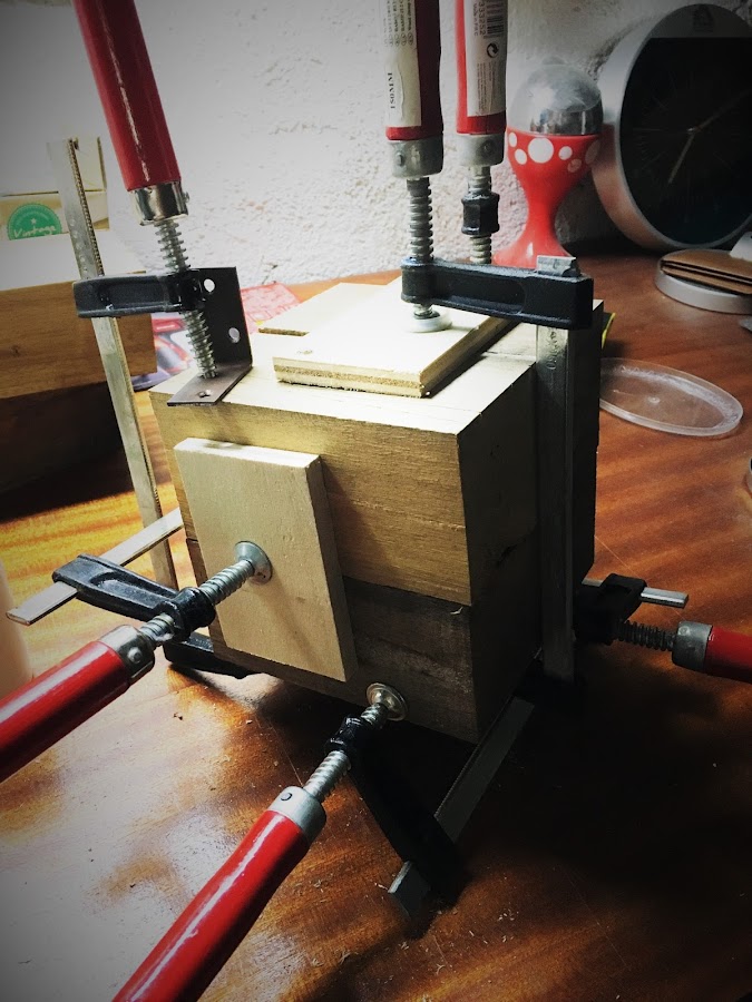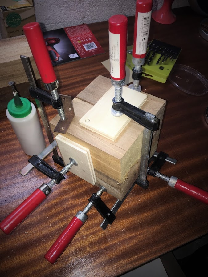 Una vez unidas y encoladas solo queda esperar a que sequen bien y yo me he ayudado de unos sargentos para formar un cubo perfecto y que las piezas no se muevan nada.