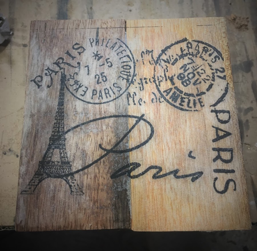 Pues empezamos con el proceso, yo vi un tutorial primero porque andaba un poco liado, el caso es que le di el liquido tanto en el dibujo como en la madera, una capa finita y bien estirada y presione con una esponja para sacar las posibles burbujas de aire.