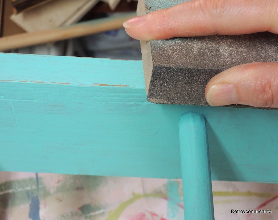 Tras un buen fregoteo, le dimos una capa de pintura a la tiza color turquesa (un resto de un color que no hemos logrado volver a conseguir, muy a pesar nuestro, porque es un tono que nos encanta).