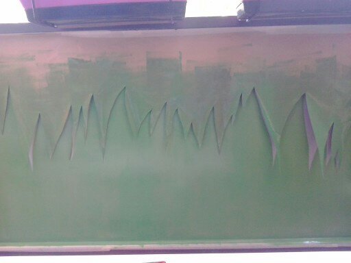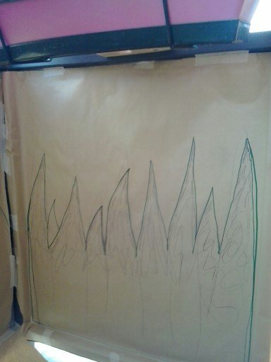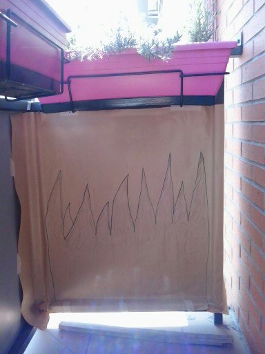 Una vez seca la pintura de la base dibuje la forma de la hierba que después pintaríamos. Lo hice un poco a ojo en cuanto a la altura y a la anchura, tratando que quedara proporcional con el tamaño del balcón e intentando no hacerlas muy finas para que me fuera mas fácil pintarlo, sin salirme mucho de la plantilla.