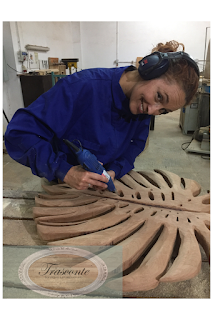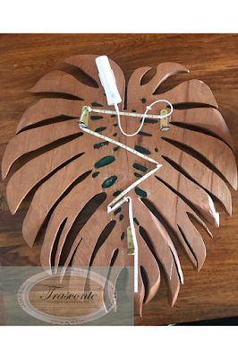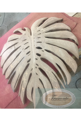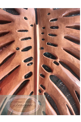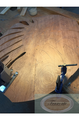Comencé dibujando una hoja en cartón piedra para realizar la plantilla, y traspasarla a la madera de Sipo. Fueron varios trozos de tablas de madera previamente encoladas.
