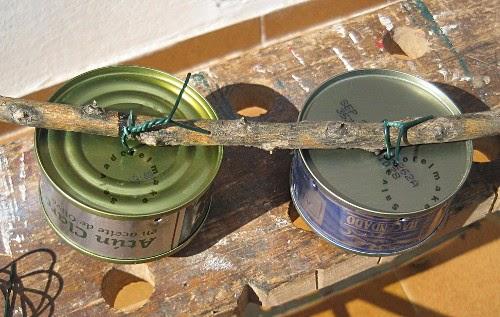 En esta ocasión he usado una rama, resto de poda, donde he sujetado con un alambre tres latas.