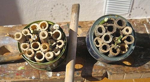 A continuación se recortan palitos y/o cañas huecas y se ponen en el interior de los envases hasta conseguir un espacio lleno de huecos donde los insectos beneficiosos puedan anidar y protegerse de sus depredadores.
