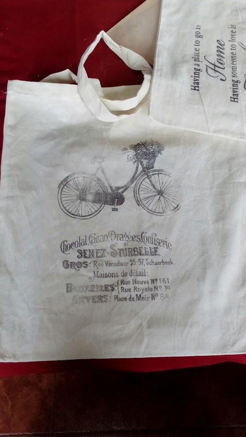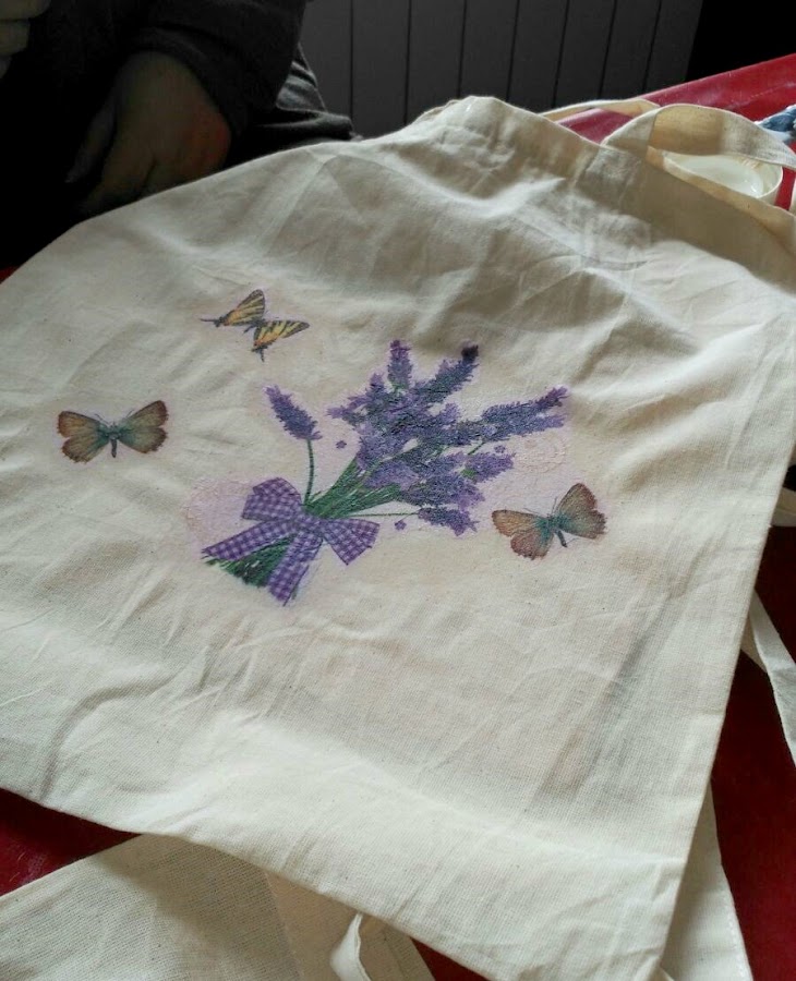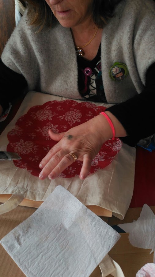 Después, y utilizando la misma bolsa (que nos había regalado Guadalupe) por la parte de atrás, hicimos DECOUPAGE TEXTIL, lo impartimos a medias Lola (El refugio de Lirtea) y yo, utilizando algunas de las servilletas que habíamos llevado para compartir y otras también preciosas, que nos regaló Ana de Manualijando.