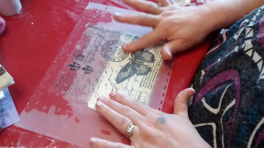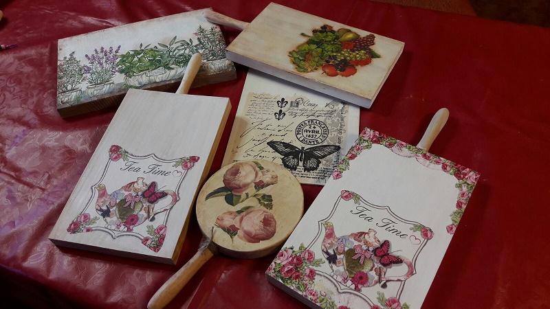 Para acabar la mañana realizamos decoupage sobre tabla con la técnica de la SERVILLETA MOJADA, que nos impartió Lola. Es una técnica muy curiosa y muy adecuada cuando la superficie que se quiere decorar es amplia, cuando vamos a usar un trozo grande de servilleta en vez de motivos recortados.
