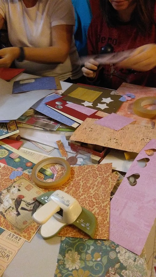 Fue un taller muy creativo, y disfrutamos muchísimo cortando, pegando y estampando todo tipo de papeles, letras, sellos...no había en toda la mesa un centímetro libre.