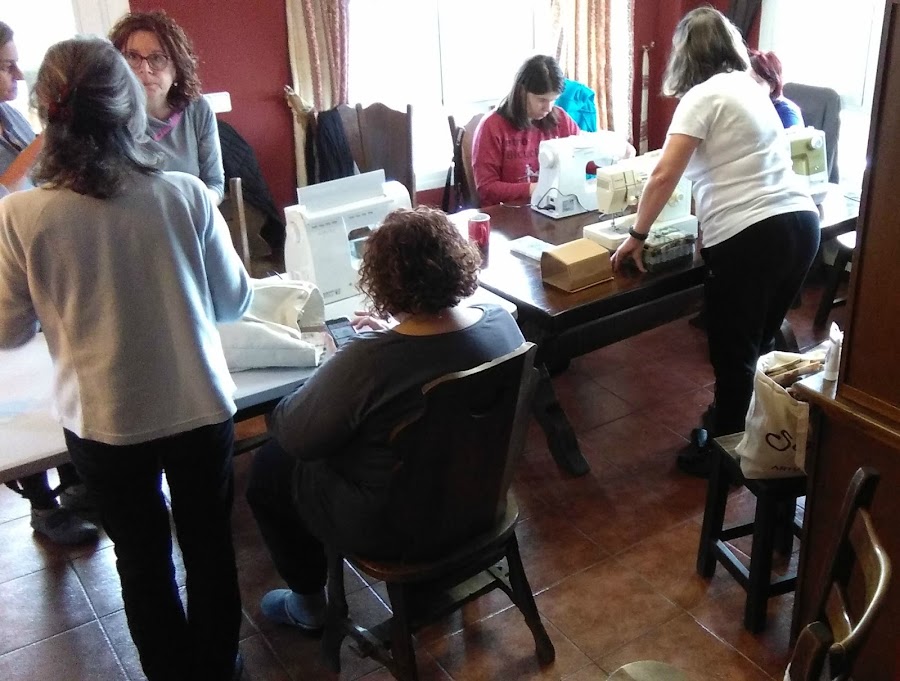 Por la tarde empezamos un taller que teníamos todas muchas ganas de realizar: BOLSITA DE TELA FORRADA, con Malores (Las labores de Malores) de paciente tallerista. Las compañeras blogueramigas de Madrid se llevaron sus máquinas de coser que compartieron con las que vivimos más lejos, para evitar más equipaje del que ya llevábamos.