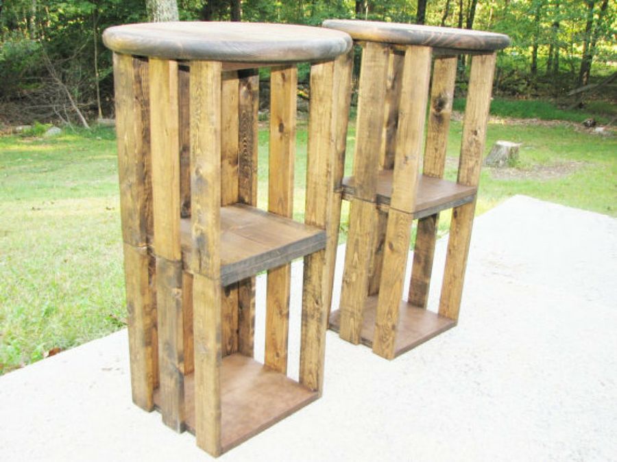 Por otro lado, otro de los clásicos es el reciclaje de cajas de madera de la fruta, que podemos emplear para fabricar prácticos muebles como esta barra, que lleva como patas cuatro de estas cajas, a juego con dos bonitos taburetes, basados en la misma idea.