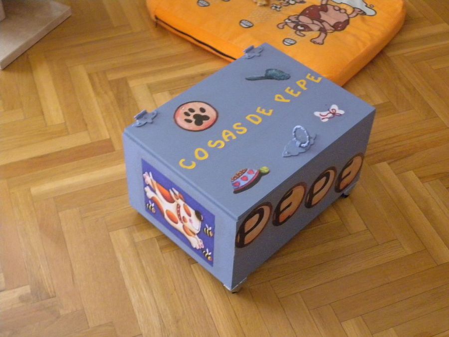 Pepe, el legítimo propietario de este fantástico baúl, no es el hijo de nuestra amiga Casero70, ¡sino su mascota! Inicialmente era una caja que hizo su costillo, y, cuenta la artista, "como no la utilizaba se la pedí y la transformé en una caja para meter las cositas de nuestro perrito. Le pegué unas láminas, recorté letras y le puse ruedas". ¡Una idea excelente para un regalo infantil!