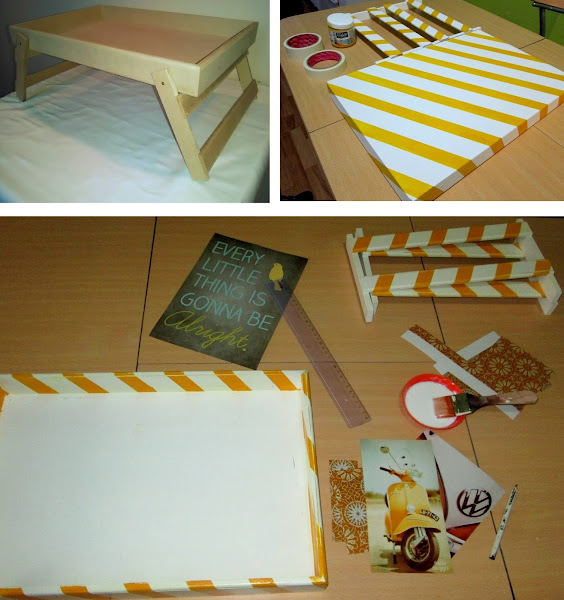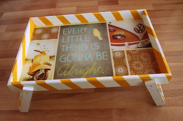 Después de lijar la bandeja asegurate de que se encuentre libre de polvo y suciedad y pintala por completo de blanco o el color que hayas elegido. Luego enmascara con la cinta de papel según el diseño que elijas, en mi caso fueron rayas a 45º pero podes hacerlas verticales, horizontales, chevron o jugar con cintas de diferentes anchos y pinta con el segundo color elegido (esto sin incluir la base de la bandeja que queda lisa).