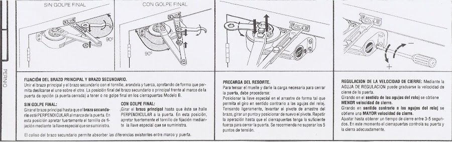 Regulación de la velocidad de cierre:Mediante la aguja de regulación puede graduarse la velocidad de cierre de la puerta.Girando en el sentido de la agujas del reloj se obtiene menor velocidad de cierre.Girando en el sentido contrario del reloj se obtiene una mayor velocidad de cierre.Ajustar hasta obtener un tiempo de cierre entre 3-5 segundos. En este momento el Brazo Automático controla su puerta y cierra adecuadamente.Mediante este Blog pretendo enseñarles como arreglar sus persianas , cambiar cintas mini ,de obra y de compactos , reparar persianas caidas o encalladas , cambiar accesorios y complemntos , etc , espero serviles de gran ayuda