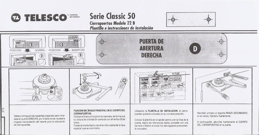 Telesco es una proveedor de Brazos Automáticos o Muelles Aéreos que los entrega preparados para instalarse en puerta derecha, por lo tanto no es necesaria ninguna manipulación del resorte para la colocación de los mismo en una puerta de esta mano.