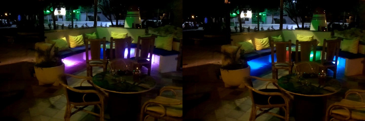 Y por último, para resaltar las palmeras decorativas del local, utilicé focos led multicolores que también se van alternando con mando a distancia. Como véis el resultado no dejó indiferente a nadie.