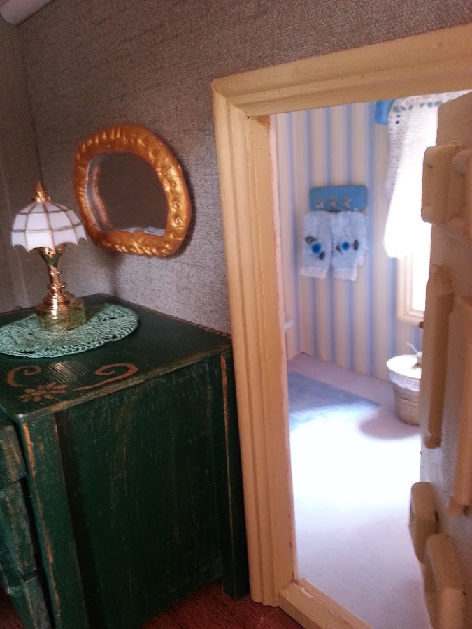El florero de encima de la estantería, es un tapón en el que pongo corcho de ese verde para poner flores secas. El porta rollos de papel higiénico también le hago con pasta de papel de secado al aire y le meto un alambre, para que haga de soporte antes que la pasta que ponga dura. El rollo le hago con un cartón fino y corto papel higiénico y también lo enrollo y lo pego, así le da mas realismo.