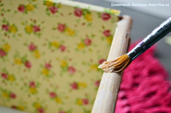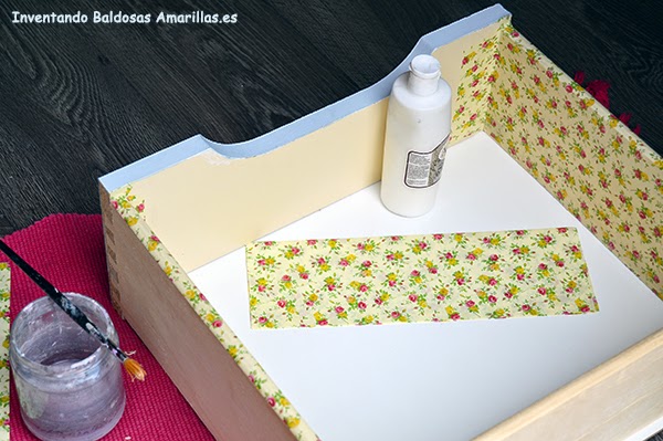 Para forrar nuestro cajón de madera con papel vamos a empezar desde el canto. Por eso cuando pongamos el pegamento, lo primero es aplicarlo en esa zona.