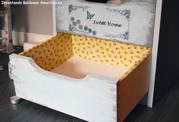 Ya tenemos el cajón forrado con papel, el problema es que ahora no me gusta cómo queda con el gris y el azul del exterior. Así que algo pensaré.