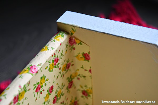En este caso, sólo vamos a forrar los cuatro laterales del cajón, dejando que se vea la madera del fondo. Para poner nuestro papel en las paredes del cajón tenemos que tener presente que dos de los lados tienen que tener dos pequeñas pestañas que se superpondrán sobre los otros dos lados. Como se ve en la foto, el papel no llega justo hasta la esquina sino que la sobrepasa.