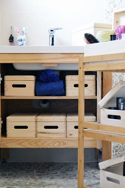 Siempre me han gustado los muebles del baño, que tienen espacio debajo para colocar cestas de madera o mimbre. Una variación sería utilizar cajas de madera para almacenar toallas, rollos de papel, botes de gel o colonia...