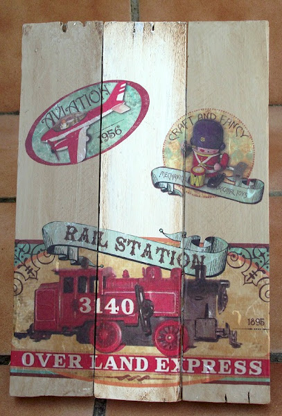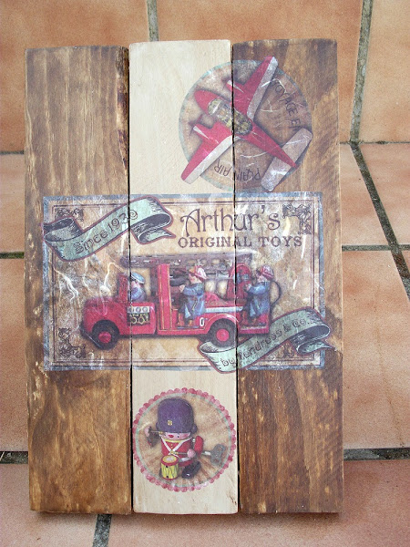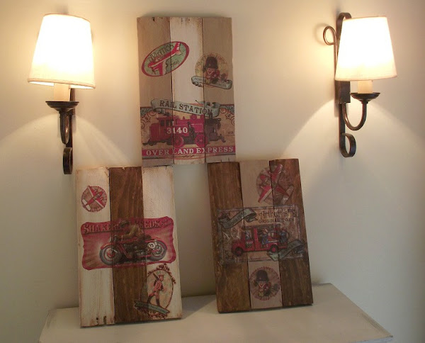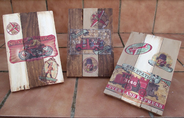 Una vez estuvieron pintadas patiné las blancas y las marrones con pátina casera al aceite, la que uso casi siempre y que os enseñé AQUÍ a preparar. Después fui haciendo un decoupage con los motivos del papel, viendo cuál era la combinación más adecuada. Y ya tenemos tres cuadritos que pueden decorar una habitación infantil, un cuarto de juegos, un estudio... me parecen muy versátiles.