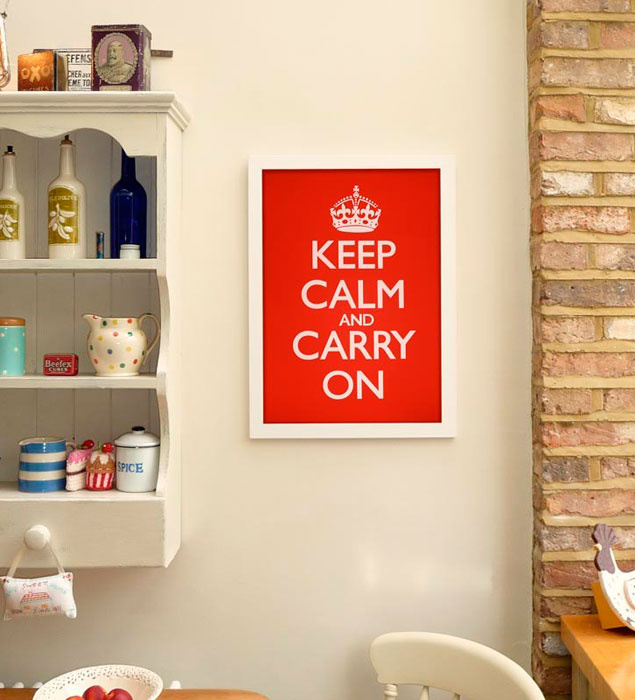 En 1939 se elaboró este eslogan por parte del imperio británico para animar a la población ante la reciente invasión nazi. El eslogan no cuajó y desapareció hasta bien entrado el año 2000. A partir de ahí fue relanzado por una pareja que vendía libros y tenia una de las primeras reproducciones del cartel. Poco después empezó a aparecer en todo tipo de decoración y moda y se modificó hasta crear cientos de eslóganes diferentes.