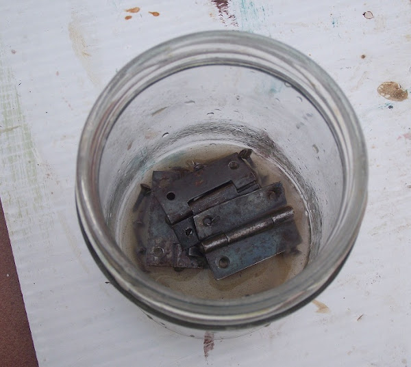 Las bisagras las quise conservar porque en una pieza como ésta poner bisagras nuevas es un "cante", pero estaban oxidadas y pringadas de la cera vieja pegajosa. Así es que seguí los siguientes pasos: