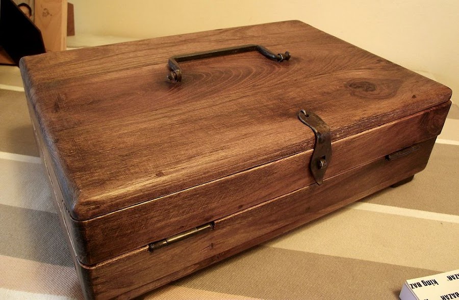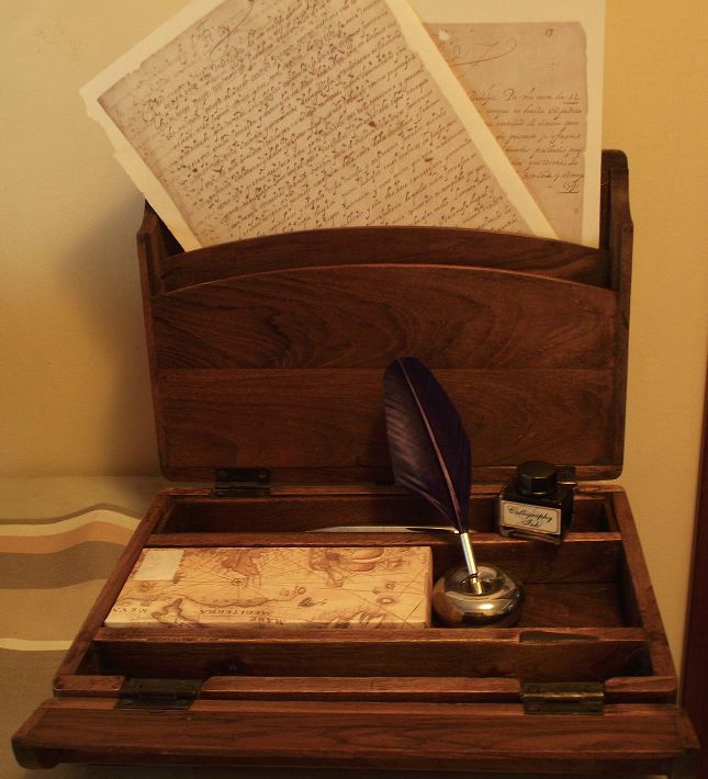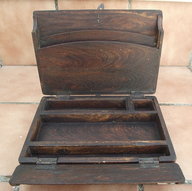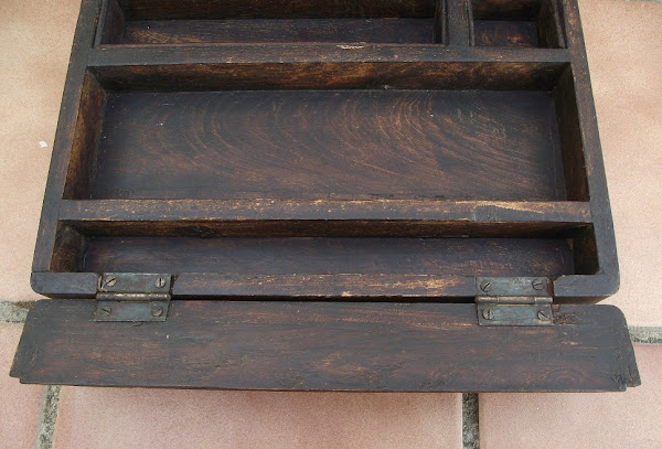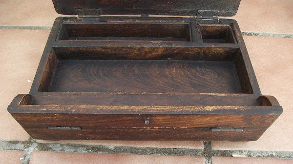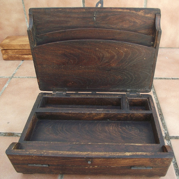 Y cuál fue mi sorpresa al abrirla: ¡¡no era una caja sino una escribanía portátil!!. El vendedor me comentó que era de procedencia portuguesa y la utilizaban los administradores y notarios de gente importante y con dinero, que en vez de ir a la oficina a resolver sus asuntos... venía la oficina a su casa para que ellos no tuvieran que desplazarse. ¡¡Sin comentarios jaja!!.