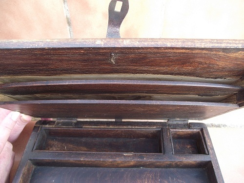 Pero hay más: la parte anterior también se abre para servir como una pequeña superficie de apoyo, supongo que los pobres administradores a veces tendrían que resolver los asuntos sobre sus rodillas, en el campo o vete a saber dónde y esta superficie extra para apoyar les venía muy bien. Eso resolvía el misterio de que estuviesen las bisagras y el cierre en el mismo lado de la caja.